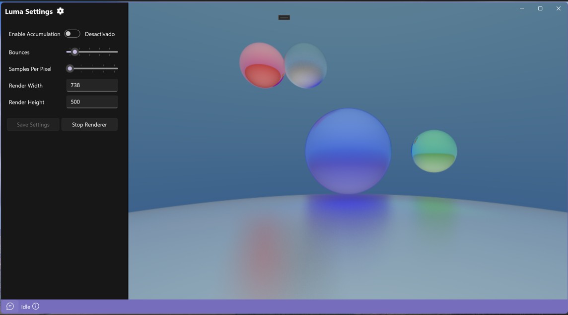 Using a memory-mapped file for efficient interprocess bitmap sharing, Luma presents a sleek, modern interface for real-time setup and manipulation of path tracing programs' renders with minimal latency and maximal quality.