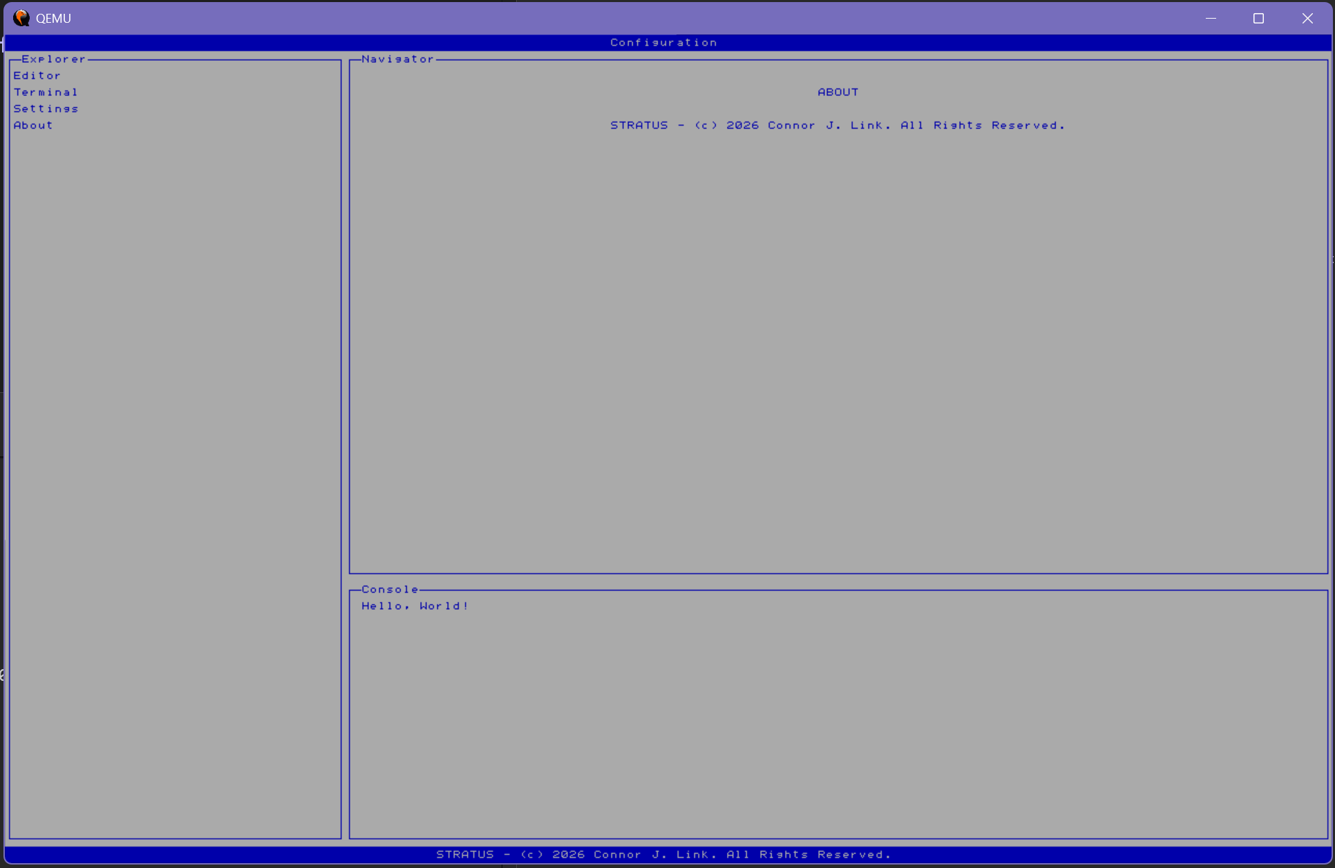 Designed specifically for RISC-V (32-bit) and the QEMU "virt" platform with a VirtIO standard GPU, Stratus implements key features like hardware drivers, memory paging and virtual allocations, and preemptive, time-sharing scheduling. The kernel uses S-mode for critical operations and offers userland code a variety of typical system calls for assistance.